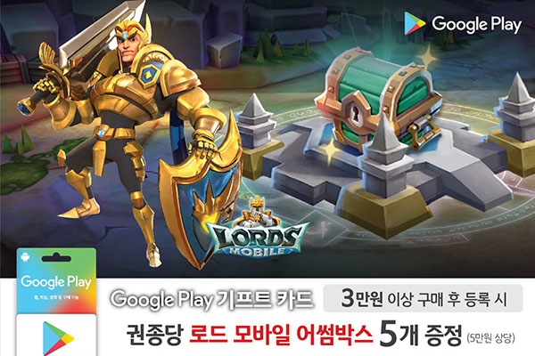 아이지지닷컴이 자사의 글로벌 모바일 전략 게임 '로드모바일'에서 구글플레이(Google Play) 기프트카드를 구매하면 게임 아이템을 보너스로 받을 수 있는 '...