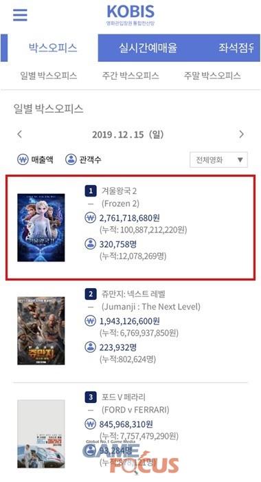 영화진흥위원회 통합전산망(12/16(월) 오전 7시 20분 기준)에 따르면, '겨울왕국 2'는 지난 13일(금) '어벤져스: 인피니티 워'(2018년, 1,121만 2,710명)를 뛰어넘고 역대 국내 개봉 외화 흥행 4위(1위 '어벤져스: 엔드게임'(2019) 1,393만 4,592명, 2위 '아바타'(2009) 1,333만 8,863명, 3위 '알라딘'(2019) 1,255만 2,213명)에 등극한 데 이어 개봉 4주 만에 누적 관객 수 1,207만 8,269명을 동원했다.