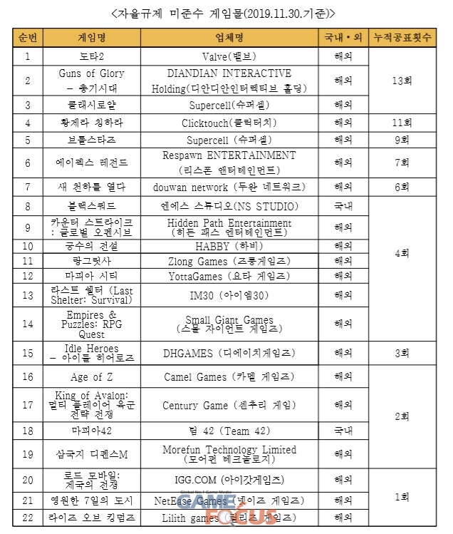 모바일 3종의 게임물이 신규 미준수 게임물로 추가되었고 전월 미준수 게임물 5종이 순위권 하락으로 모니터링 대상에서 제외되면서 2019년 11월 말까지의 자율규제 미준수 게임물은 총 22종이다.