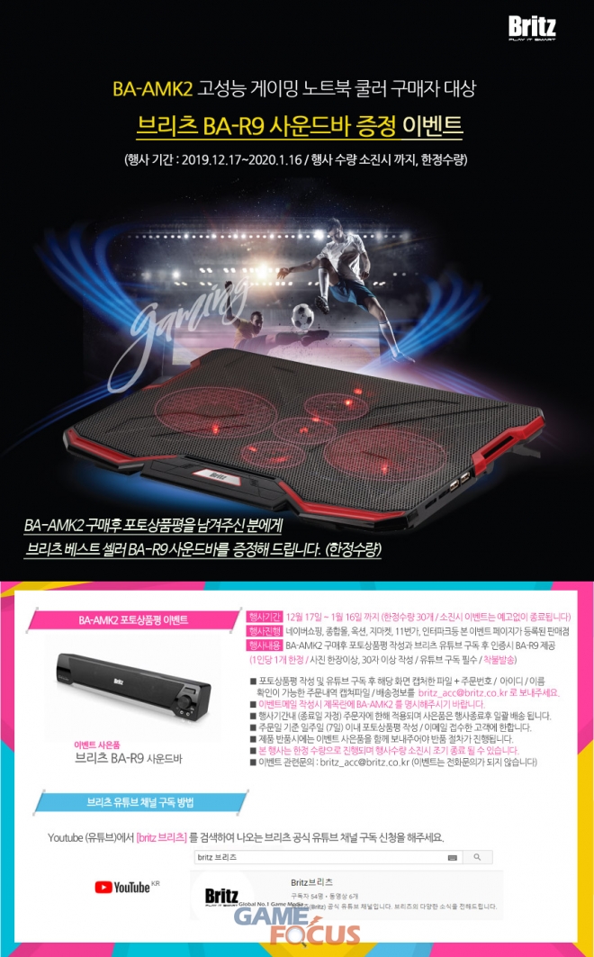 브리츠가 지능형 LED 5쿨링 패드 'BA-AMK2'를 선보이며, 구매자 한정 증정 이벤트를 연다.