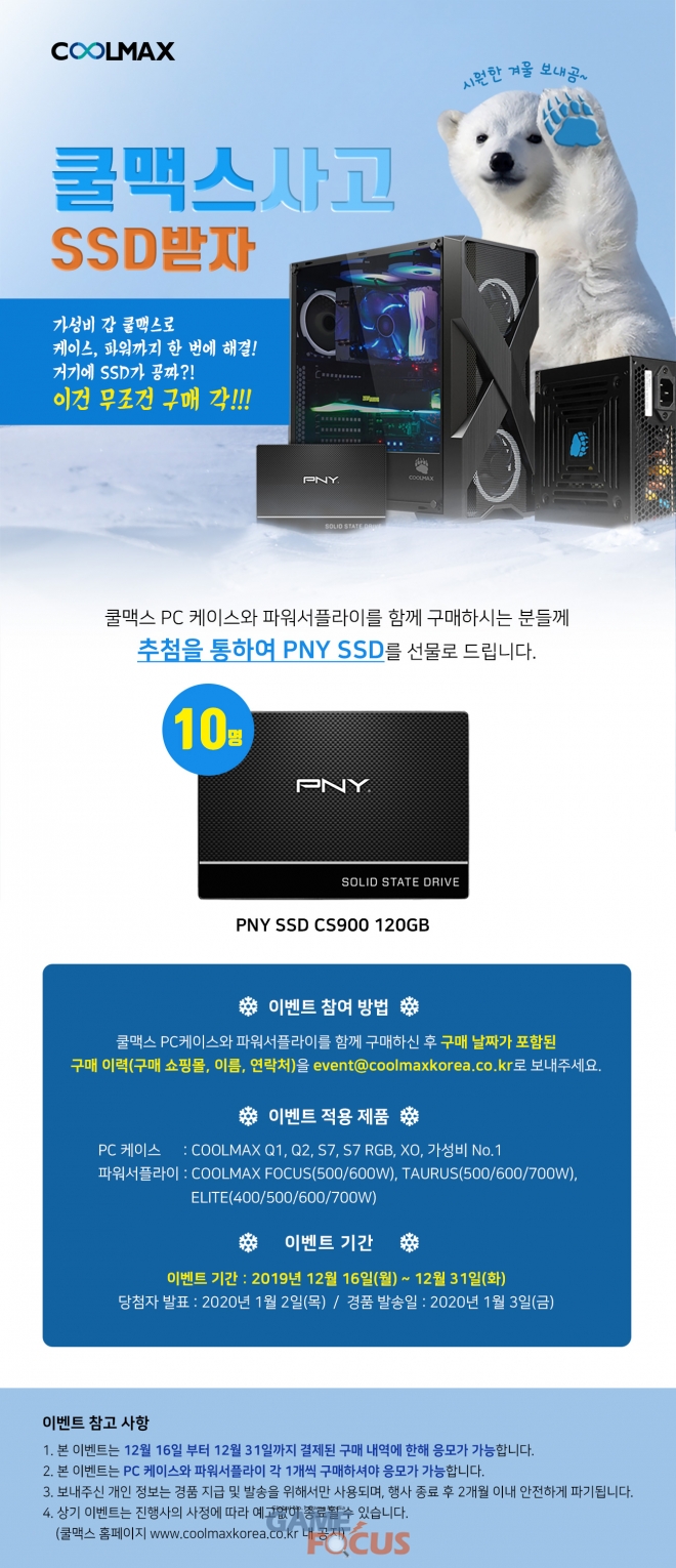높은 가격대비성능으로 꾸준한 사랑을 받고 있는 쿨맥스 브랜드의 케이스와 파워서플라이를. 함께 구매하는 구매자 대상으로 진행 되는 이벤트는 이번 연말인 12월 31일까지 진행되며, 이벤트가 종료되면 1월 2일 목요일 추첨을 통해 1명에게 PNY SSD CS900 120GB를 증정할 예정이다.