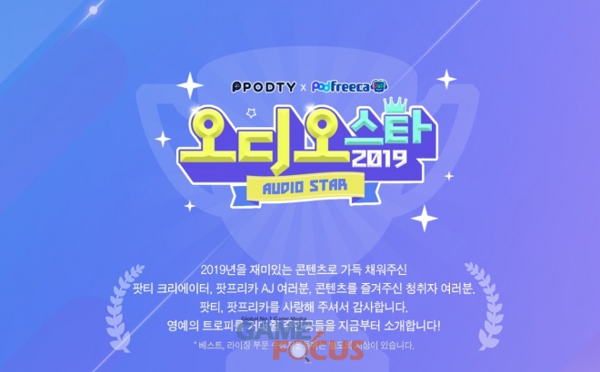 아프리카TV 자회사 프릭엔이 자사가 운영하는 오디오플랫폼인 팟티(Podty)와 팟프리카(Podfreeca)에서 올 한해 가장 큰 활약을 보여준 크리에이터와 AJ(Audio Jockey)를 선정해 공개하는 '2019 오디오스타'를 진행한다. 팟티와 팟프리카의 부문별 수상 크리에이터 및 AJ의 명단은 19일 2019 오디오스타 페이지를 통해 공개됐다.