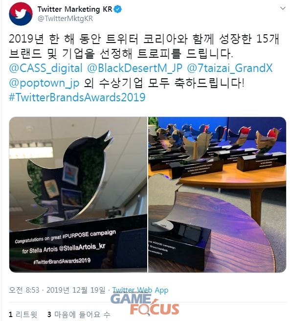 트위터 브랜드 어워드 2019는 별도의 시상식 없이 수상 기업에게 트로피를 전달할 예정이다.
