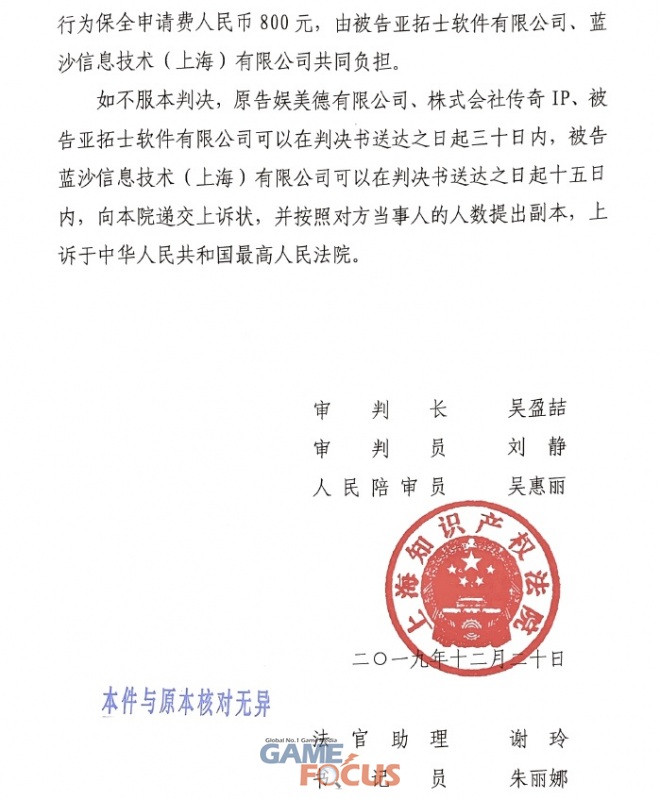 이와 함께 재판부는 '저작권법 위반은 맞지만, 계약법 제52조 제5항의 규정에 따르면 법률이나 행정법규의 강행규정을 위반할 때에 계약이 무효로 되는데, 이 사건에서 피고 액토즈 회사가 위반한 행정법규의 규정은 계약을 무효로 만드는 강행규정에는 해당되지 아니한다. 따라서 이런 이유로 사건 연장계약의 무효를 인정하면 안되어 두 원고의 관련 주장에 대하여 본법원은 인용하지 않는다'고 하며 계약을 무효로 선언하지는 않았다.