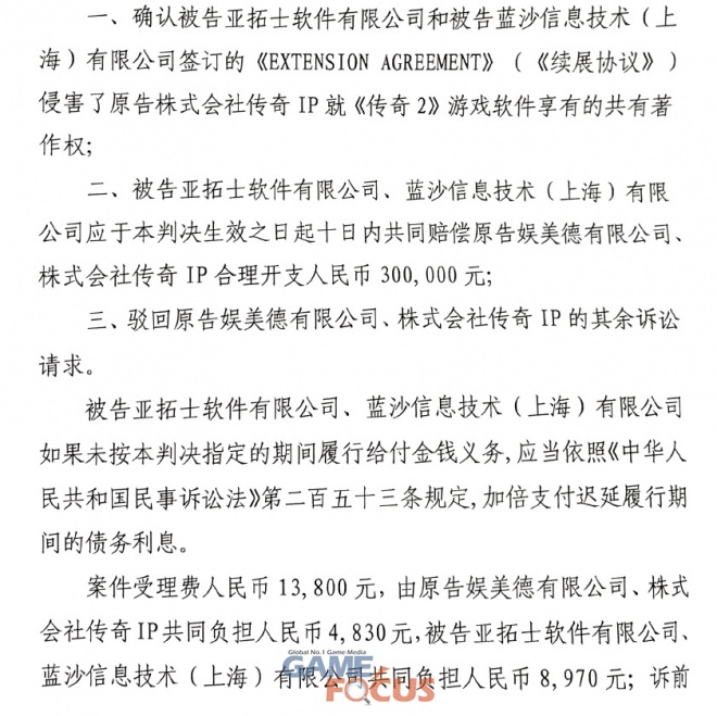재판부는 '액토즈와 랸사(샨다)의 '연장계약' 체결 이전 원고 위메이드와 협상하지 않았으므로 피고 액토즈회사는 공유저작권자의 권리를 단독으로 행사해서는 안 된다'고 판단했다. 이에 '두 피고(액토즈, 란샤)의 '연장계약'을 체결한 행위는 중화인민공화국 저작권법실시조례 제9조, 소프트웨어보호조례 제10조의 규정 및 2004년 '화해조서'의 약정에 반하는 것이며 원고(현재는 원고 전기아이피)의 사건 게임 소프트웨어에 대해 누리는 공유저작권을 침해하였다'고 판결했다.