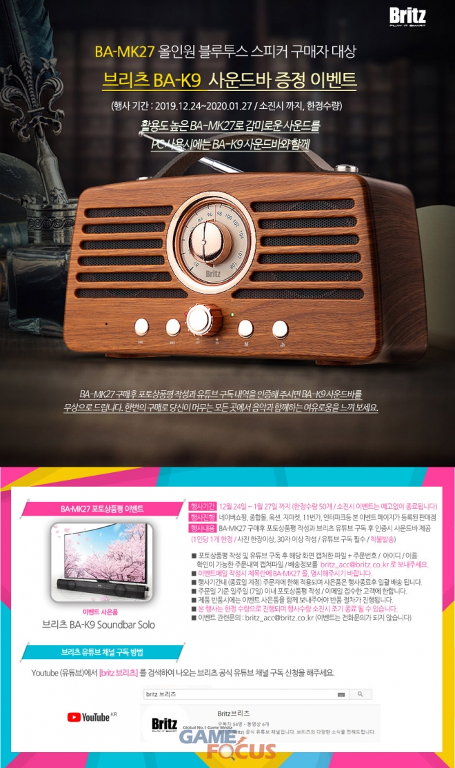한편 브리츠는 'BA-MK27' 구매자 대상으로 지난 24일부터 2020년 1월 27일까지 'BA-K9' 사운드바 증정 이벤트를 진행한다. 네이버 쇼핑, 종합몰, 옥션, 지마켓, 11번가, 인터파크 등 이벤트 페이지가 등록된 판매점에서 구매 후 포토상품평을 작성하고, 브리츠 공식 유튜브 채널을 구독하면 이벤트에 참여할 수 있다.