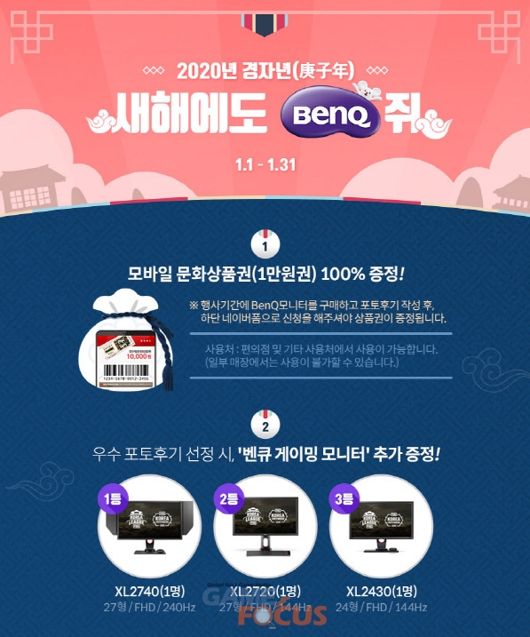 벤큐코리아 마케팅팀 이상현 팀장은 "벤큐는 게이밍 모니터는 주사율과 승률을 높여주는 기능들이 탑재되어 e스포츠 선수들뿐 아니라 게임을 즐기는 많은 분들에게 사랑을 받고 있는 제품이다. 2020년 새해를 맞아 게이밍 모니터 중에서도 가장 많은 사랑을 받고 있는 제품들을 포토후기 경품으로 선정했다"라며 "240Hz의 고주사율을 탑재한 XL2740과 작년 PKL, PKC 공식 모니터로 성능을 인정받은 XL2720 (27인치, 144Hz), 24인치 144Hz를 지원하는 XL2430까지 다양한 라인업을 경품으로 준비했으니 문화상품권 뿐 아니라 '벤큐 게이밍 모니터'의 주인공이 되시길 바란다"고 전했다.