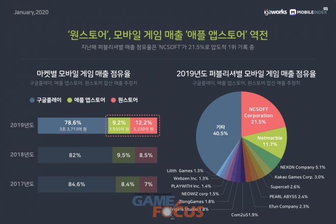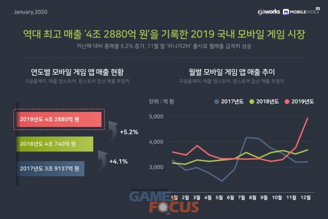 모바일 빅데이터 플랫폼 기업 아이지에이웍스의 모바일인덱스 데이터 분석에 따르면, 2019년 대한민국 모바일 게임 시장은 총 매출 4조 2,880억 원을 기록했으며 이는 전년 대비 5.2% 상승한 역대 최고 매출 기록. 특히 엔씨소프트의 '리니지2M' 정식 서비스에 힘 입어 12월에는 매출이 급증했으며, '원스토어'가 구글플레이에 이어 매출 점유율 2위를 기록했다.