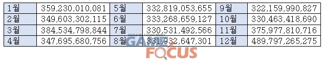 2019년 월별 모바일 게임 앱 매출 추이 (단위: 원)