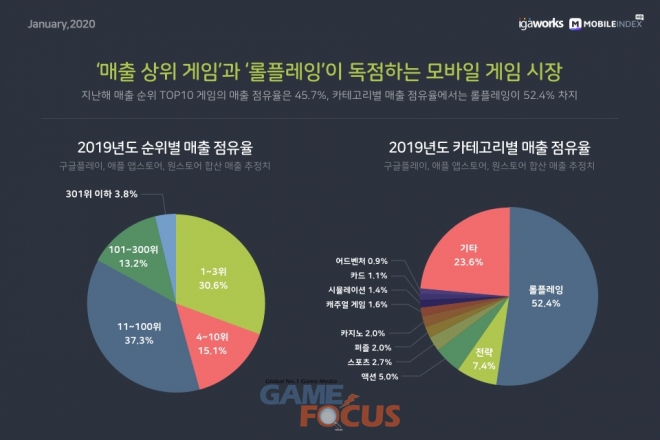 2019년 게임 카테고리별 매출 점유율로는 롤플레잉이 52.4%로 압도적인 점유율을 차지했으며 전략(7.4%), 액션(5.0%) 등이 순위에 올랐다.