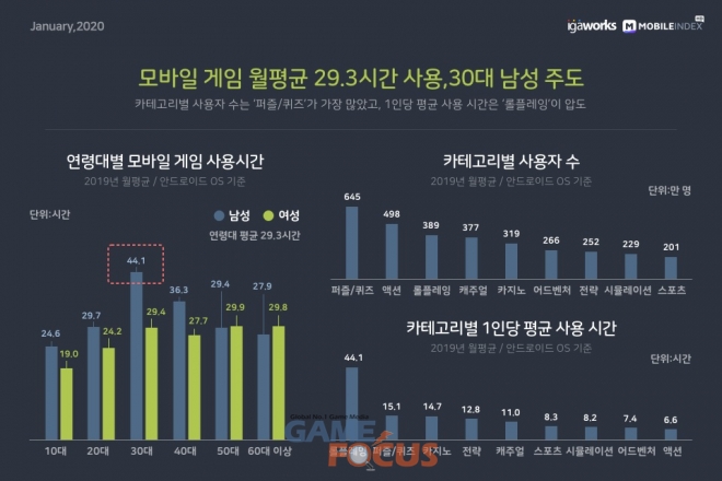 카테고리별 1인당 평균 사용시간은 '롤플레잉' 게임이 44.1시간을 기록하면서 압도적인 1위에 올랐으며, 퍼즐/퀴즈(15.1시간), 카지노(14.7시간), 전략(12.8시간), 캐주얼(11.0시간) 등이 뒤를 이었다.