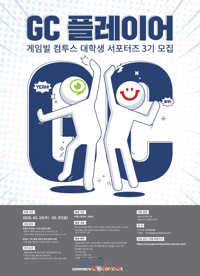 게임빌-컴투스가 함께 모집하고 있는 'GC 플레이어'는 게임빌과 컴투스에 관심이 많은 대학생(휴학생 가능)이라면 누구든지 지원할 수 있으며, 내달 7일까지 지원서를 받는다.