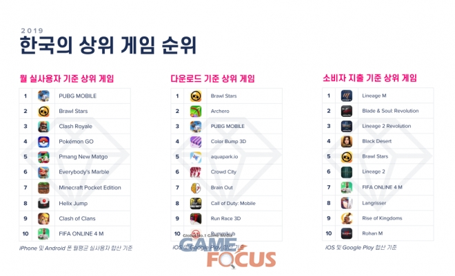 2019년 가장 많은 다운로드 수 기록한 게임은 1위가 '브롤스타즈', 2위가 '궁수의 전설', 3위가 '배틀 그라운드'로 나타났으며, 소비자 지출액은 '리니지 M', '블레이드 앤 소울: 레볼루션', '리니지 2 레볼루션'이 순서대로 상위 3위를 차지했다. MAU가 가장 높은 게임은 1위가 '펍지 모바일', 2위가 '브롤스타즈', 3위가 '클래시 로얄'로 나타났다.