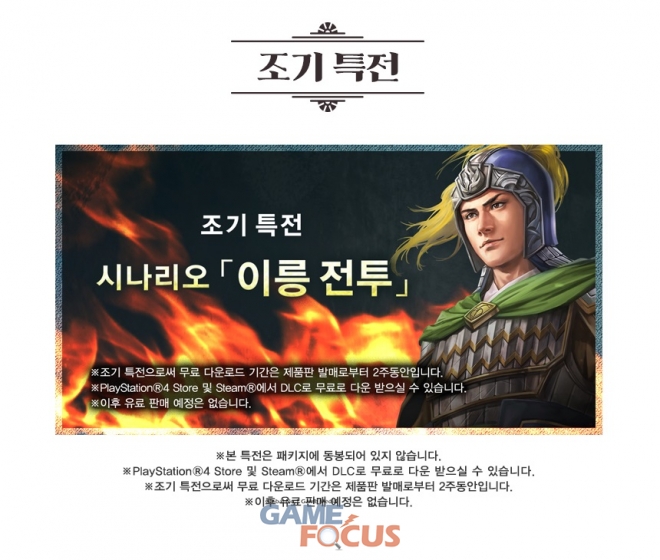 또한, 조기 특전으로 제공되는 시나리오 '이릉 전투'와 플레이 데이터 수집판의 다운로드 수 달성 보수인 시나리오 '정시정변'을 각각 1월 29일(수)까지 무료로 다운로드할 수 있다.