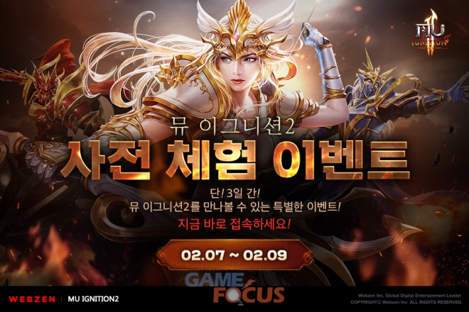 웹젠은 자사의 PC 웹게임 '뮤 이그니션2'의 공식 홈페이지를 열고, 게임회원 모집을 시작했다. 공식 홈페이지에서 게임 회원으로 가입한 가입자는 누구나 오는 2월 7일(금)부터 2월 9일(일)까지 3일간 정식 서비스 전에 게임에 미리 접속해 볼 수 있다.