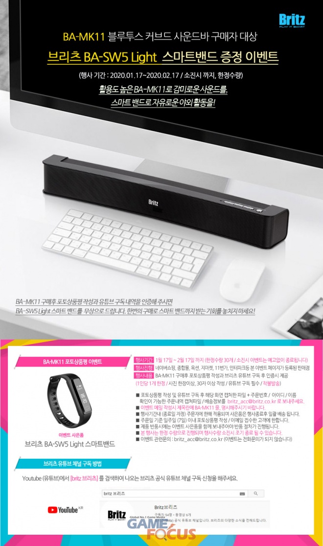 한편 브리츠는 'BA-MK11' 구매자 대상으로 오늘(17일)부터 내달 17일까지 약 한 달간 한정수량으로 스마트 밴드 'BA-SW5 Light' 증정 이벤트를 실시한다. 참여방법은 네이버 쇼핑, 종합몰, 옥션, 지마켓, 11번가, 인터파크 등 이벤트 페이지가 등록된 판매점에서 구매 후 포토상품평을 작성하고, 브리츠 공식 유튜브 채널을 구독한다. 이벤트 페이지 내 안내된 이메일 주소로 이를 확인할 수 있는 내역과 함께 접수하면 정상 응모된다.