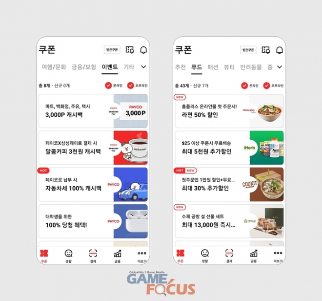 '페이코 맞춤쿠폰' 서비스는 설을 앞두고 선물 쇼핑과 나들이, 외식에 유용한 쿠폰을 마련했다. 현대백화점 e수퍼마켓과 아이허브에서는 각각 페이코로 결제 시 최대 8,000원, 5,000원 할인 쿠폰을 사용할 수 있다. NS홈쇼핑은 페이코 이용자를 대상으로 최대 12% 앱 할인 쿠폰을, GS SHOP은 최근 6개월 자사 구매 이력이 없는 페이코 회원에게 적립금 5,000원을 제공한다. 그 외 롯데월드 이용권 최대 50% 할인 혜택을 비롯해 영화관(CGV, 롯데시네마), 식음료(피자헛, 버거킹), 패션·뷰티(안다르, 에뛰드하우스) 분야 130여 개 제휴 업체와의 쿠폰 프로모션이 1월 말까지 진행된다.
