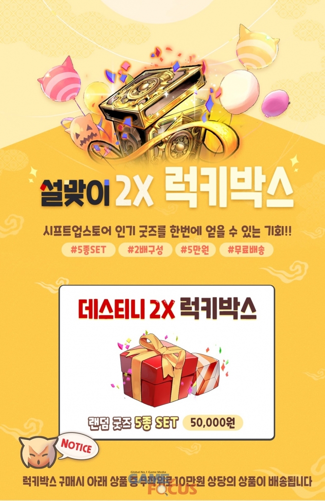시프트업은 '데스티니 차일드' 굿즈(머천다이즈)를 판매하는 '시프트업 스토어'에서 10만 원 상당의 굿즈를 반값에 구매할 수 있는 '설맞이 2X 럭키박스' 이벤트를 오는 1월 31일까지 진행한다. 럭키박스에는 대형 일러스트 족자봉, 인형 쿠션, 아크릴 스탠드 등 5종의 상품을 무작위로 구성해 선보인다. 또한, 5만 원 이상 구매시 캔뱃지, 티셔츠, 자외선 차단 스티커, 홀더 4종 전부를 총 100명에게 증정한다.
