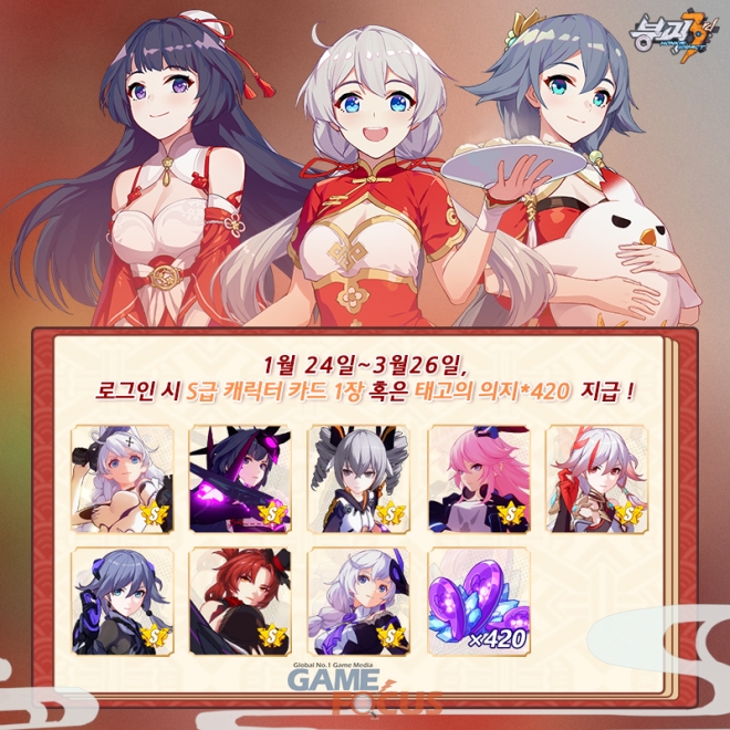 이번 설날 이벤트는 그간 '붕괴3rd'를 아껴주신 유저들에게 감사하는 마음을 담아 23일 오전 10시부터 3월 26일 오전 4시까지 진행, 통 크게 아이템을 선물할 예정이다.