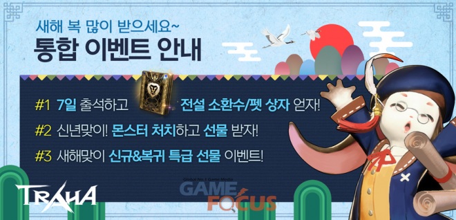 '트라하'에서는 24일부터 27일까지 게임에 접속만 해도 '소환수/펫/정령카드 희귀~전설', '빛나는 세공석' 등 아이템으로 구성된 '새해 선물상자'를 지급하고, 23일부터 29일까지는 '정령카드 전설', '소환수/펫 전설' 등을 제공한다. 또 이달 2월 12일까지 여러 미션을 완수해 획득한 주사위로 이벤트에 참여하면 '소환수/펫 희귀~전설', '정령카드 희귀~전설', '축복 받은 세공석' 등 보상을 얻을 수 있다.
