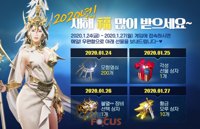 '다크어벤저 3'에서는 24일부터 27일까지 접속 시 매일 '모험열쇠 200개', '불멸++ 장비 선택 상자' 등 특별 보상을 제공한다. 또 27일까지 공식 커뮤니티에 올해 소망을 댓글로 작성하고 50개 이상 누적 시 이용자 전체에게 '펫 소환권 2개'를 지급하는 '2020 경자년! 새해 소망을 말해보아요' 이벤트를 실시한다.