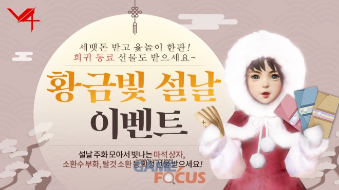 'V4'에서는 지난 21일부터 '황금빛 설날 이벤트'를 진행하고 있다. 이용자는 'V4' 공식 홈페이지에서 세뱃돈을 찾아 게임 재화인 골드와 교환할 수 있으며, 윷놀이 이벤트로 설날 주화를 모으면 '희귀 동료', '빛나는 마석 상자', '소환수 부화' 등 보상 아이템을 획득할 수 있다.