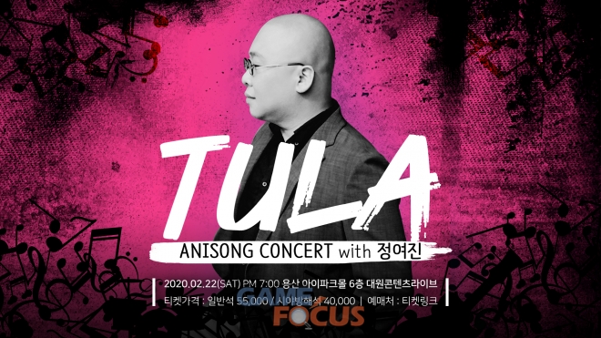 대원미디어가 2월 22일 오후 7시, 용산 아이파크몰 6층 팝콘D스퀘어에 위치한 '대원콘텐츠라이브'에서 애니송 가수 'TULA'의 데뷔 20주년을 기념하기 위한 특별 이벤트의 일환으로 진행되는 <TULA ANISONG CONCERT with 정여진> 라이브 콘서트를 진행한다.