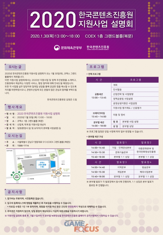 문화체육관광부(장관 박양우, 이하 문체부)와 한국콘텐츠진흥원(원장 김영준, 이하 콘진원)은 오는 30일(목) 13시 서울 코엑스 그랜드볼룸에서 ‘2020 한국콘텐츠진흥원 지원사업 설명회(이하 지원사업 설명회)’를 개최한다.