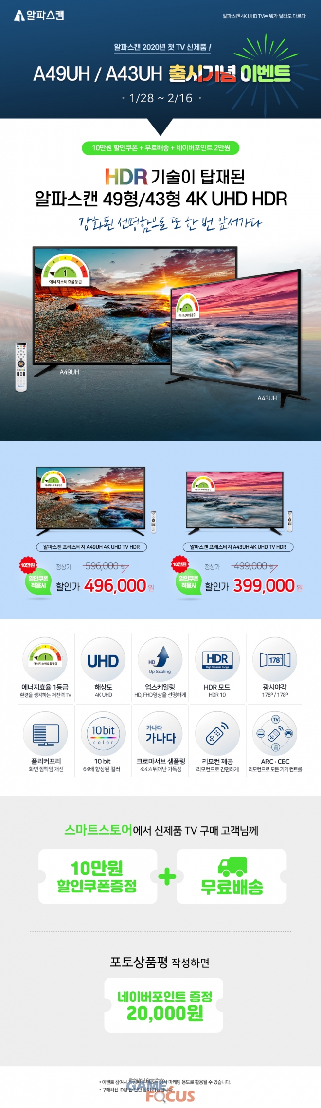 알파스캔이 초고해상도 43인치와 49인치 4K UHD TV 신제품 출시 기념으로 할인행사를 진행하고 있다. 알파스캔 스마트스토어에서 2월 16일까지 진행되는 이번 행사에서는 10만원 할인쿠폰을 제공해 'A43UH'는 399,000원, 'A49UH'는 496,000원에 구매할 수 있고, 배송도 무료로 진행된다. 또한 제품 구매 후 포토상품평을 작성하면 네이버 포인트 2만원을 받을 수 있다.