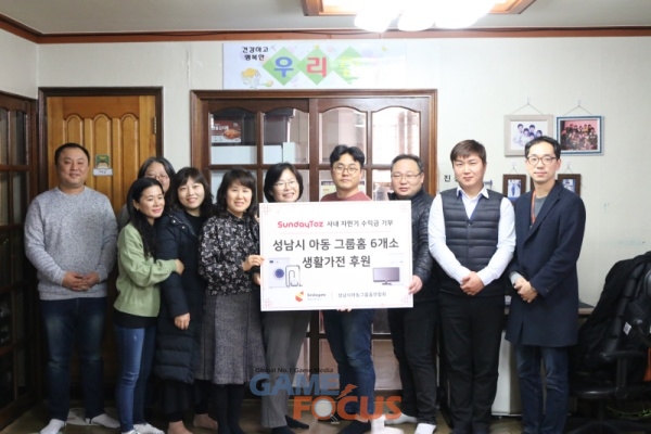 선데이토즈는 지난 31일, 성남시의 취약 계층 아동들이 거주하고 있는 그룹홈 6개소에 김치냉장고, 컴퓨터, 의류건조기, 세탁기 등 660여만 원 상당의 생활가전 제품을 기증했다. 이번 후원품이 선데이토즈가 사랑의 자판기를 운영하며 모금한 지난해 판매금으로 마련된 점은 기업 내 기부 문화 육성에 나서고 있는 회사와 구성원들의 각별한 온정을 담았다는 점에서도 의미를 더한다.