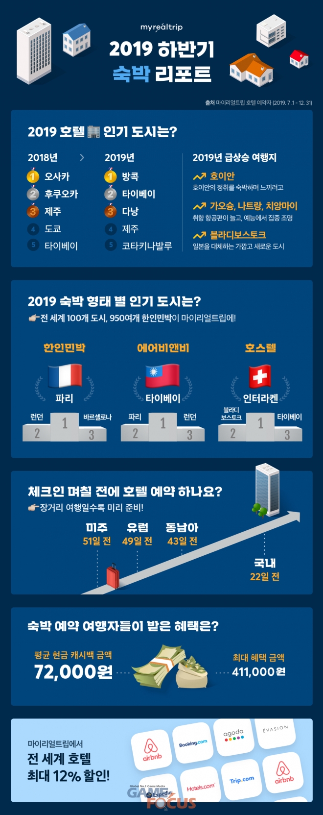여행상품 중개 플랫폼을 운영하는 트래블 테크 기업 마이리얼트립(대표 이동건)이 '2019 하반기 숙박 리포트'를 발표했다. 보고서에 따르면 지난해 하반기에 호텔 예약이 가장 많았던 도시는 방콕, 한인 민박은 파리로 나타났다.
