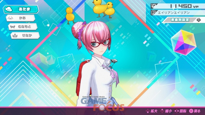 '머리', '얼굴', '가슴', '등' 부위별로 커스터마이징 아이템을 설정할 수 있다. 아이템을 소지하지 않았을 때는 VP에서 '구매'하면 착용할 수 있다. 마음에 드는 아이템을 조합하여 다양한 코디를 즐기자.