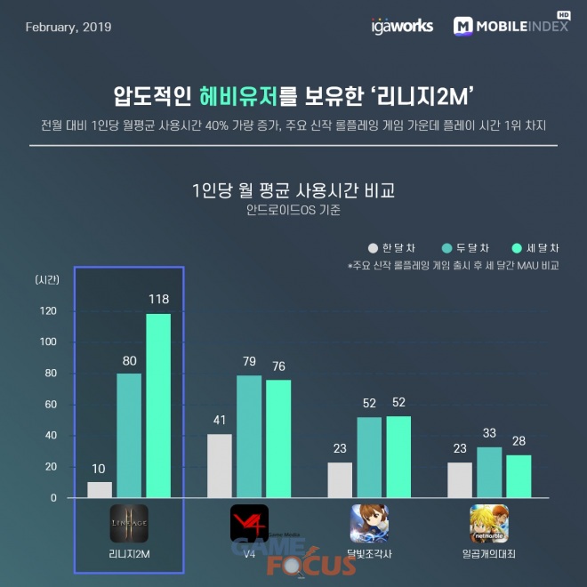 이 밖에도, 1월 기준 '리니지2M'의 1인당 월평균 사용시간은 118시간으로, 주요 신작 롤플레잉 게임 가운데 1위를 차지하면서 2위인 'V4'와 격차를 벌리고 있다.