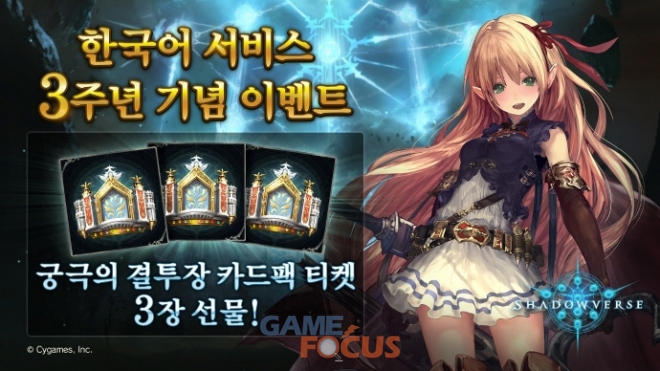 사이게임즈코리아(대표 와타나베 코우이치)는 대전형 온라인 CCG ‘섀도우버스’의 국내 정식 출시 3주년을 맞아 기념 이벤트를 진행한다고 10일 밝혔다.