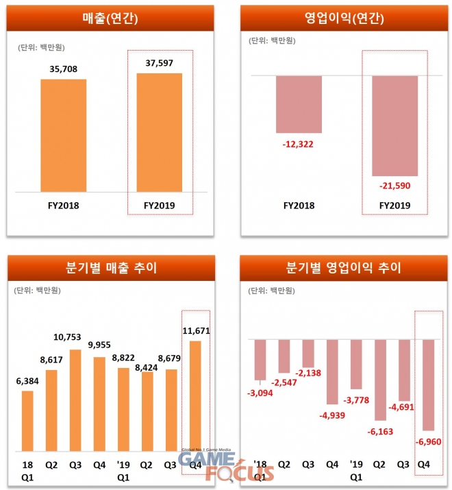 연간 기준 2019년 전체 매출액은 376억 원으로 전년 대비 5% 증가했다. 영업손실 및 당기순손실은 각각 216억 원과 131억 원이며, 신작 출시 준비를 위한 개발 인력 확충으로 영업 비용이 증가돼 손실 규모가 확대됐다.