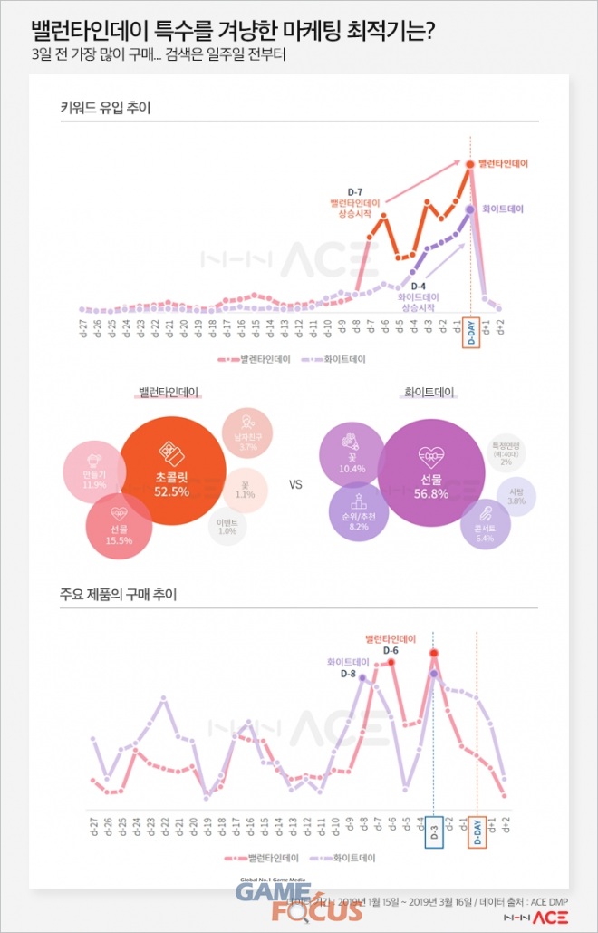 NHN ACE(공동대표 정연훈, 이진수)는 밸런타인데이 시즌을 맞아 데이터 관리 플랫폼 ‘ACE DMP’를 활용, PC·모바일 웹사이트에서 발생한 관련 데이터를 분석한 ‘인사이트 리포트’를 공개했다. 이번 리포트는 작년 밸런타인데이, 화이트데이 시즌(2019년 1월 15일~3월 16일)에 유입된 1만개 이상의 키워드 유입 데이터와 제품 구매 데이터를 분석했다. 키워드 유입 데이터는 웹사이트 방문자가 어떤 단어를 검색해 유입됐는 지 파악할 수 있는 데이터다.
