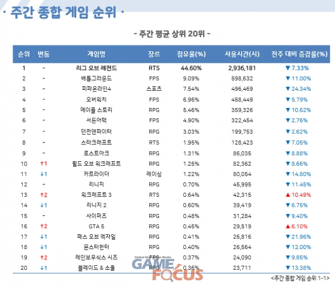 먼저 1위~10위권을 살펴보면 모든 게임의 전주 대비 사용시간이 감소한 가운데 '배틀그라운드'가 다시 2위 자리에 올라섰다. '배틀그라운드'는 전주 대비 사용시간이 11.0% 감소하였으나 점유율 9.09%를 기록했다. 이어 '월드 오브 워크래프트' 역시 사용시간 감소세에도 점유율 1.25%를 기록하며 한 단계 상승한 10위에 랭크되었다.