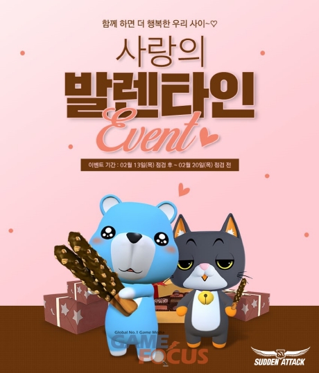 먼저, '서든어택'에서는 2월 13일부터 2월 20일까지 친구 및 짝과 함께 '제3보급구역' 또는 '더 갓모드'를 5판 플레이할 시 '러블리 수류탄(영구제)', '키스 수류탄(영구제)', 'Throw 초코스틱(영구제)' 등으로 구성된 달콤살벌 선물상자, 키스가방을 보상으로 제공한다.