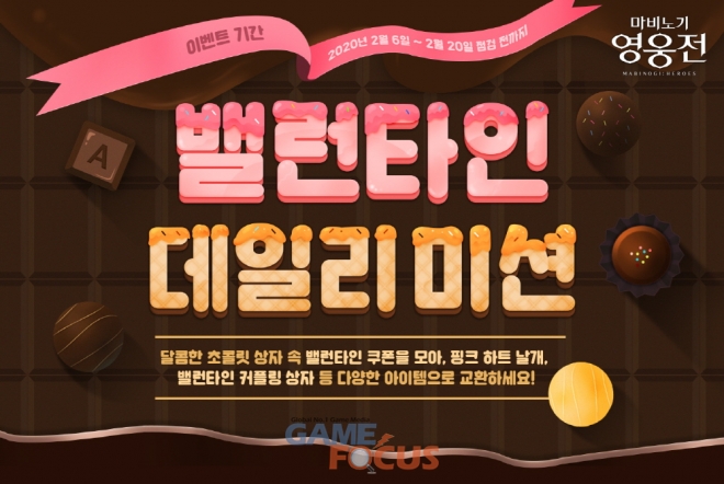 '마비노기 영웅전'에서는 2월 20일까지 '밸런타인 데일리 미션'을 진행한다. 이벤트 스토리 및 일일 미션을 완료할 경우 '밸런타인 쿠폰'과 '달콤한 밸런타인 초콜릿 5개'를 획득할 수 있는 '달콤한 초콜릿 상자'를 얻을 수 있으며, 수집한 '밸런타인 쿠폰'은 전용 교환상점에서 '핑크 하트 날개', '밸런타인 커플링 상자' 등 다양한 아이템으로 교환할 수 있다.