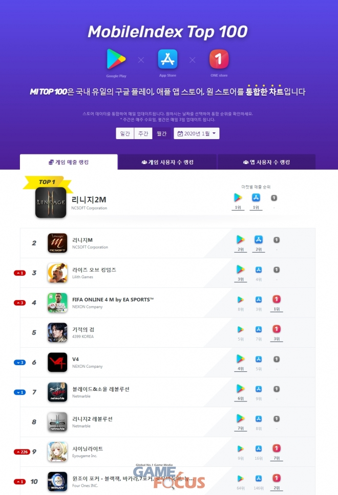 4위를 차지한 넥슨의 '피파 온라인 4M(FIFA ONLINE 4M by EA SPORTS)'은 지난 11월 9위, 12월 7위에 이어 1월 4위까지 오르며 지속적인 상승세를 기록 중이다. 특히, 원스토어에서는 매출 랭킹 4위에서 1위로 단숨에 오르는 잠재력을 보여주었다.