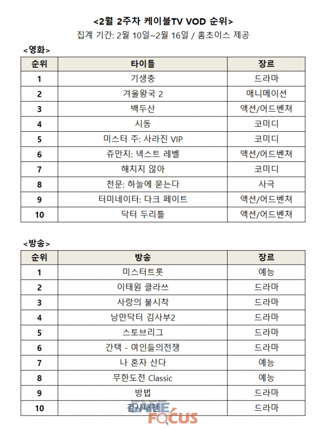 홈초이스가 전국 케이블TV 가입자들을 대상으로 서비스 한 '2월 2주차 영화·방송 VOD' 순위에 따르면, '기생충'이 영화 VOD 순위 1위를 차지했다.