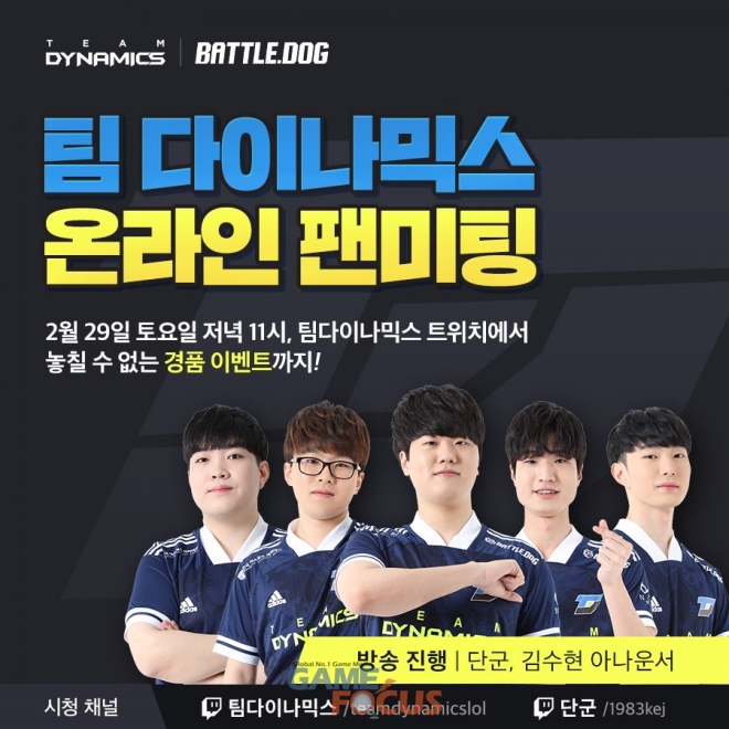 이번 팬미팅에는 '리치', '페이즈', '비욘드', '쿠잔', '구거' 등 팀다이나믹스 선수 전원이 참여하며, 진행에는 단군과 김수현 아나운서가 맡을 예정이다.