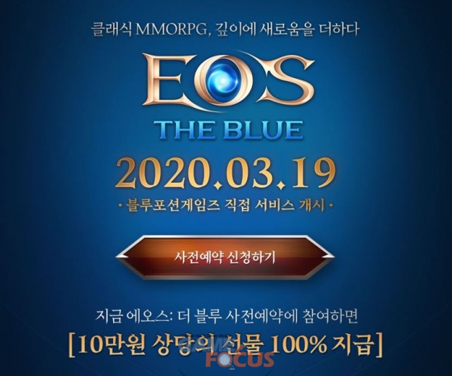 블루포션게임즈(대표 신현근)가 자사가 개발하고 3월 19일부터 직접 서비스를 시작하는 PC 온라인 MMORPG '에오스'의 공식 커뮤니티를 오픈하고, 이와 함께 ''에오스 : 더 블루' 사전예약 프로모션'을 시작한다.