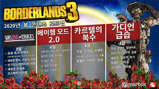마지막으로, 올봄에 추가될 보더랜드 3 이벤트 및 업데이트의 윤곽을 살펴볼 수 있는 콘텐츠 로드맵이 공개되었다.