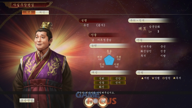 먼저 '사실 무장 편집'은 게임 내 1,000명에 달하는 사실 무장에 대해서 그 능력이나 개성 전법, 정책 등 다양한 데이터를 자유롭게 편집할 수 있는 기능이다. 마음에 드는 무장의 능력을 강하게 하거나 개성을 더욱 부각시키는 등 플레이어 마음대로 편집이 가능하다.