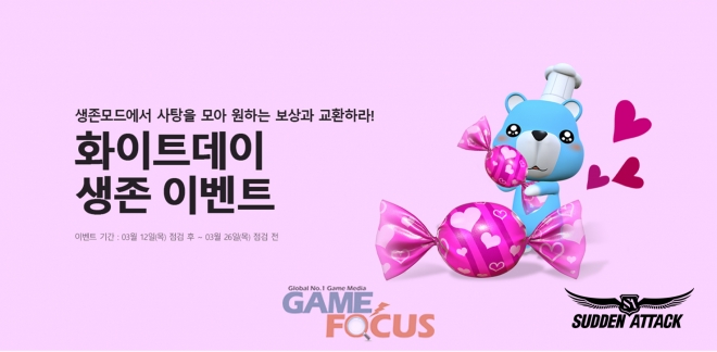 먼저 '서든어택'에서는 파밍 난이도 하향, 신규 무기 추가 등을 통해 더욱 쉽게 개편된 생존모드 '제32구역', '시범단지', '파이널존'에서 3월 26일까지 필드 드랍된 사탕을 모을 시 개수에 따라 '보조 기간연장 영구제'와 '캔디 수류탄 영구제'는 1회씩, 3만 통합 경험치는 최대 10회까지 교환할 수 있다. 또한, 3월 18일까지 겨울 업데이트 감사 이벤트로 매일 오후 3시부터 9시 사이 정각마다 게임을 즐기면 '잠겨진 영구제 BOX', 'M4A1(IS) Flower(영구제)', 'NA-94 마법봉(영구제)' 등을 즉시 보상으로 제공한다.