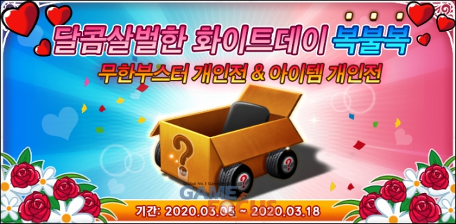'카트라이더'에서는 무작위로 주어진 카트바디로 경주하는 '화이트데이 복불복 모드'를 3월 18일까지 오픈한다. '무한부스터 스피드 개인전'이나 '아이템 개인전'으로 참여 가능하며, 해당 모드를 플레이한 유저에게는 '핑크 풍선 오라' 등 달콤한 분위기의 아이템을 얻을 수 있는 '핑크 도넛 상자'를 지급한다. 한편 '도넛 알바생 나린'과 '핑크 도넛 플라잉 펫'도 게임 내 상점에서 기간 한정으로 선보인다.
