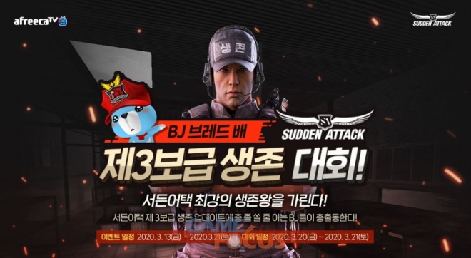 대회는 20일과 21일 양일간 서든어택에 새롭게 업데이트 된 제3보급 생존모드로 펼쳐진다. 대회에는 아프리카TV의 인기 FPS BJ '킴성태', '손대한', '제리스나' 등 총 18명이 3인 1개조 6개팀을 구성해 참여한다.