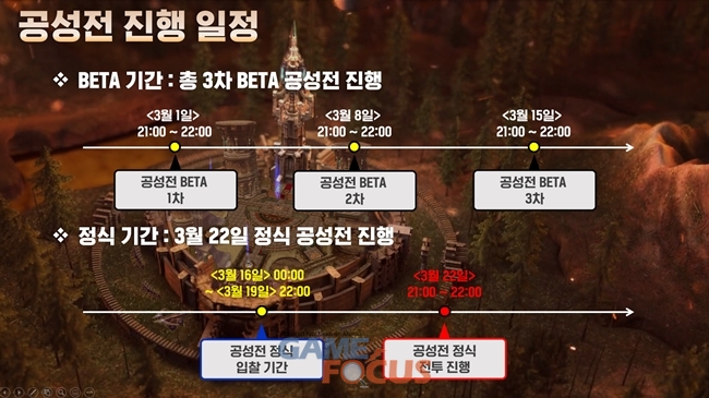 블루포션게임즈는 정식 공성전을 앞두고 3월 중순까지 세 차례의 공성전 BETA 진행을 통해 밸런스와 안정성을 검증하였으며, 16일부터 정식 공성전 입찰이 시작되어 길드 간의 치열한 눈치싸움이 진행중이다.