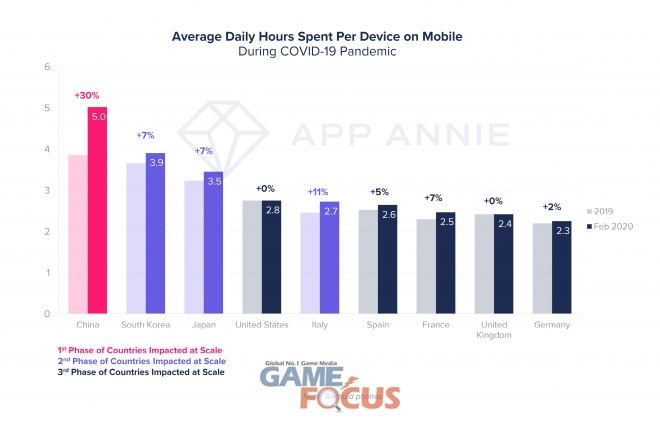 유럽에서 가장 많은 확진자가 발생한 이탈리아의 경우 2월 모바일 사용시간이 11%가 증가했다. 초기 발생국인 한국 및 일본이 각각 7%씩 증가하면서 그 뒤를 이었다.